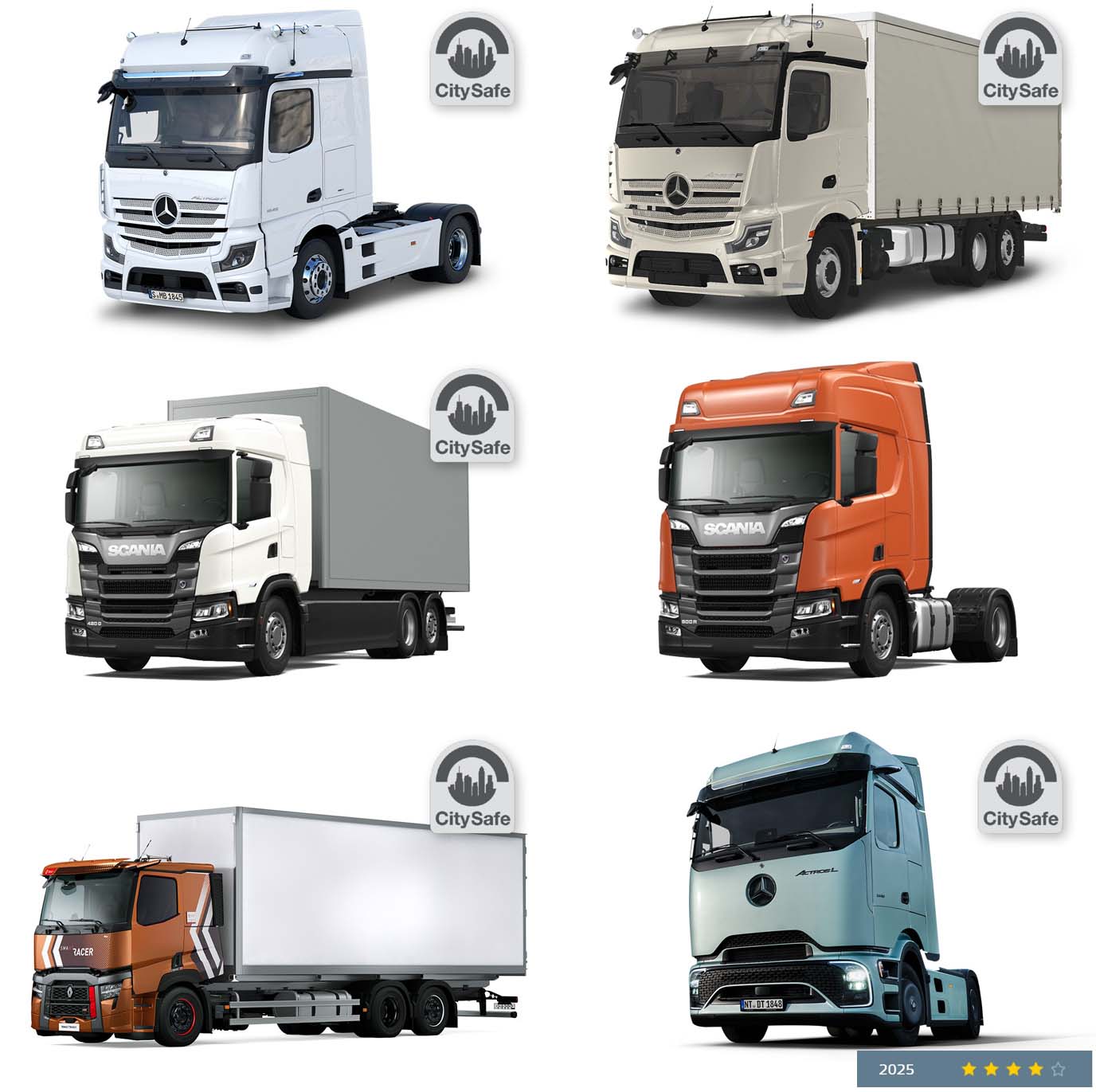Tu je potrebno istaći da su Mercedes-Benz i Scania poboljšali svoje sigurnosne rezultate, u odnosu na prošlogodišnje ocjenjivanje, dok Renaultov T model sada dolazi sa sistemom za detekciju biciklista sa strane, a to poboljšanje mu je donijelo oznaku CitySafe.