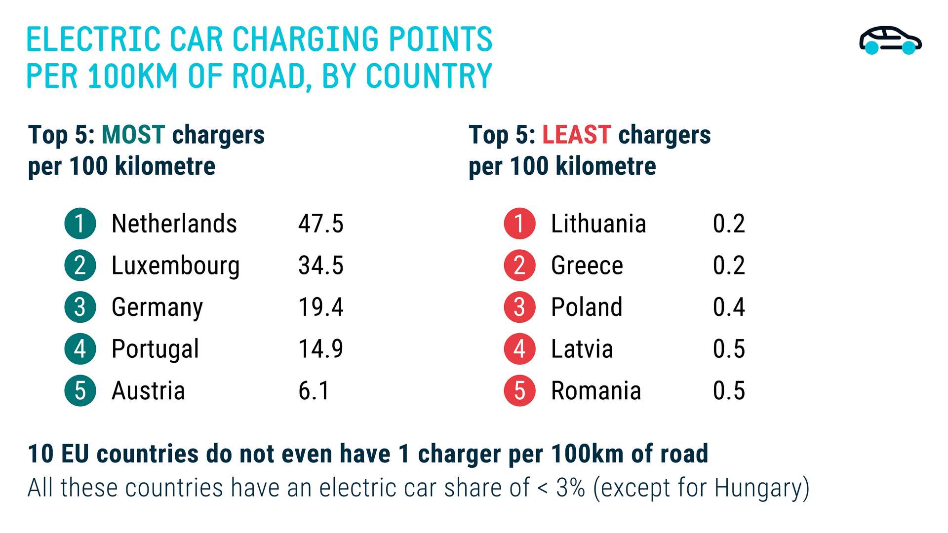 | Država | Broj punjača | Broj brzih punjača (+22 kW) | Udio brzih punjača | Broj punjača na 100 km | Tržišni udio električnih vozila |
